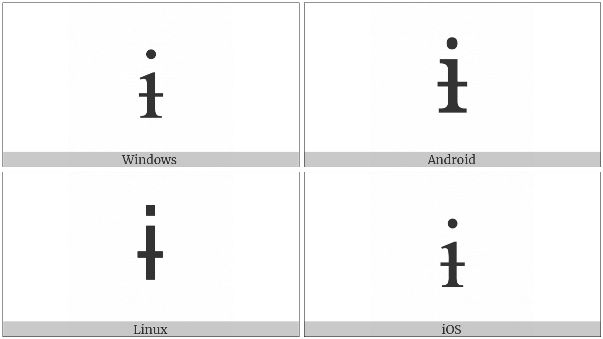 The image below shows how the “Latin Small Letter I With Stroke” symbol might look like on different operating systems. If the font in which this web site is displayed does not contain the symbol and there is no fallback font able to render it, you can use the image below to get an idea of what it should look like.