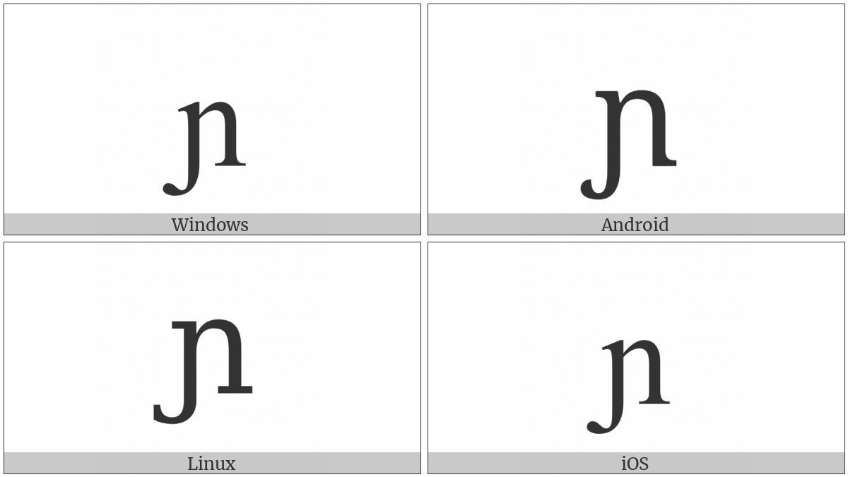 The image below shows how the “Latin Small Letter N With Left Hook” symbol might look like on different operating systems. If the font in which this web site is displayed does not contain the symbol and there is no fallback font able to render it, you can use the image below to get an idea of what it should look like.