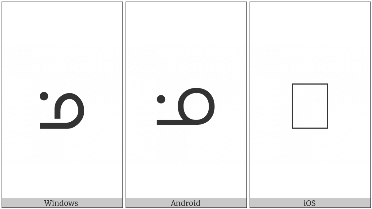 The image below shows how the “Canadian Syllabics Nwo” symbol might look like on different operating systems. If the font in which this web site is displayed does not contain the symbol and there is no fallback font able to render it, you can use the image below to get an idea of what it should look like.