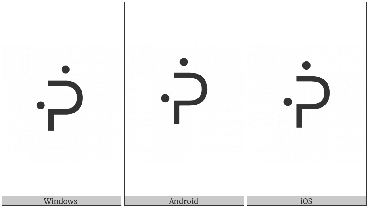 The image below shows how the “Canadian Syllabics Rwoo” symbol might look like on different operating systems. If the font in which this web site is displayed does not contain the symbol and there is no fallback font able to render it, you can use the image below to get an idea of what it should look like.