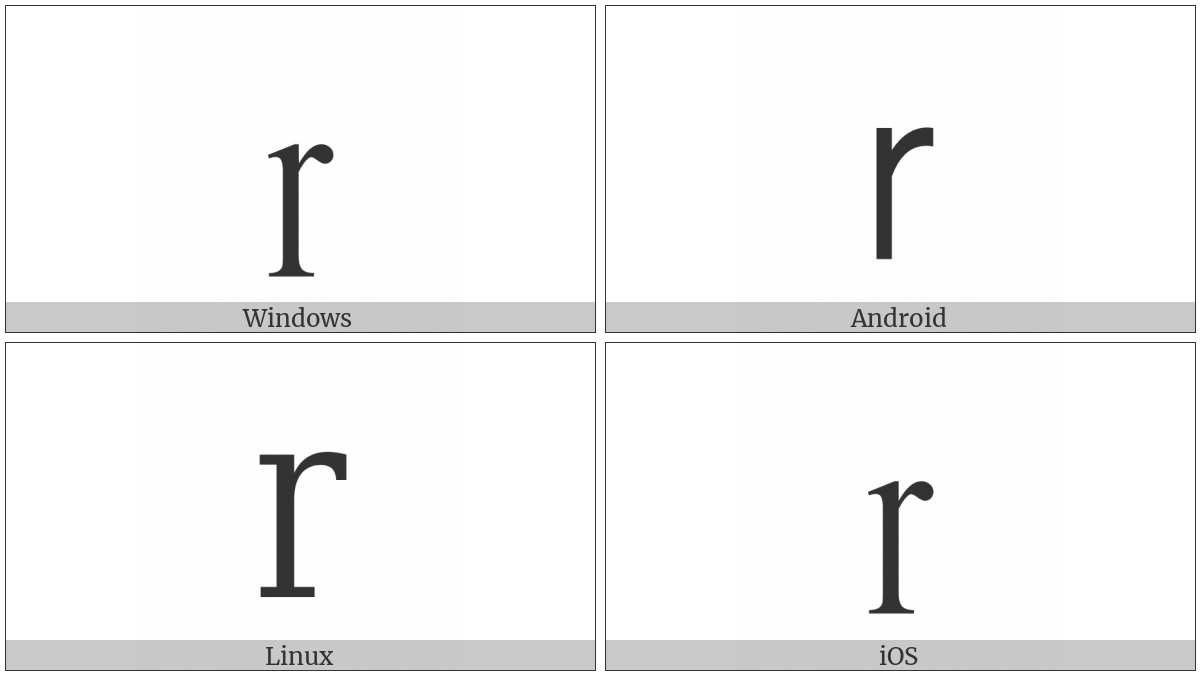 The image below shows how the “Latin Small Letter R With Long Leg” symbol might look like on different operating systems. If the font in which this web site is displayed does not contain the symbol and there is no fallback font able to render it, you can use the image below to get an idea of what it should look like.
