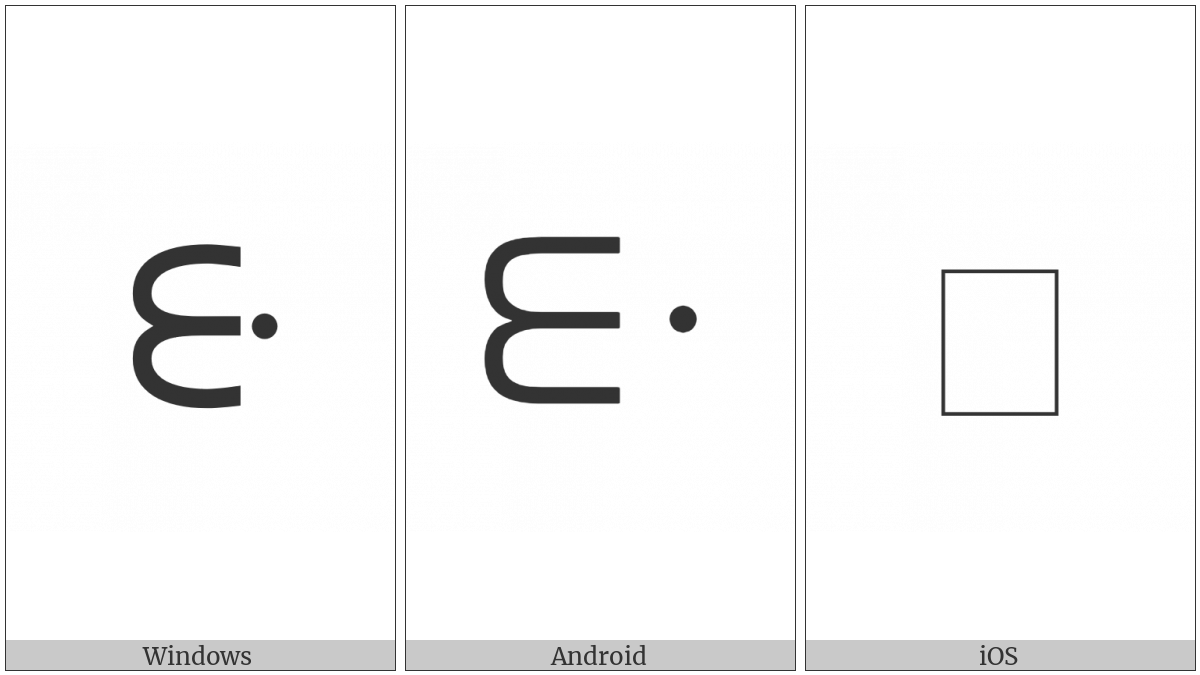 The image below shows how the “Canadian Syllabics Carrier Gwa” symbol might look like on different operating systems. If the font in which this web site is displayed does not contain the symbol and there is no fallback font able to render it, you can use the image below to get an idea of what it should look like.