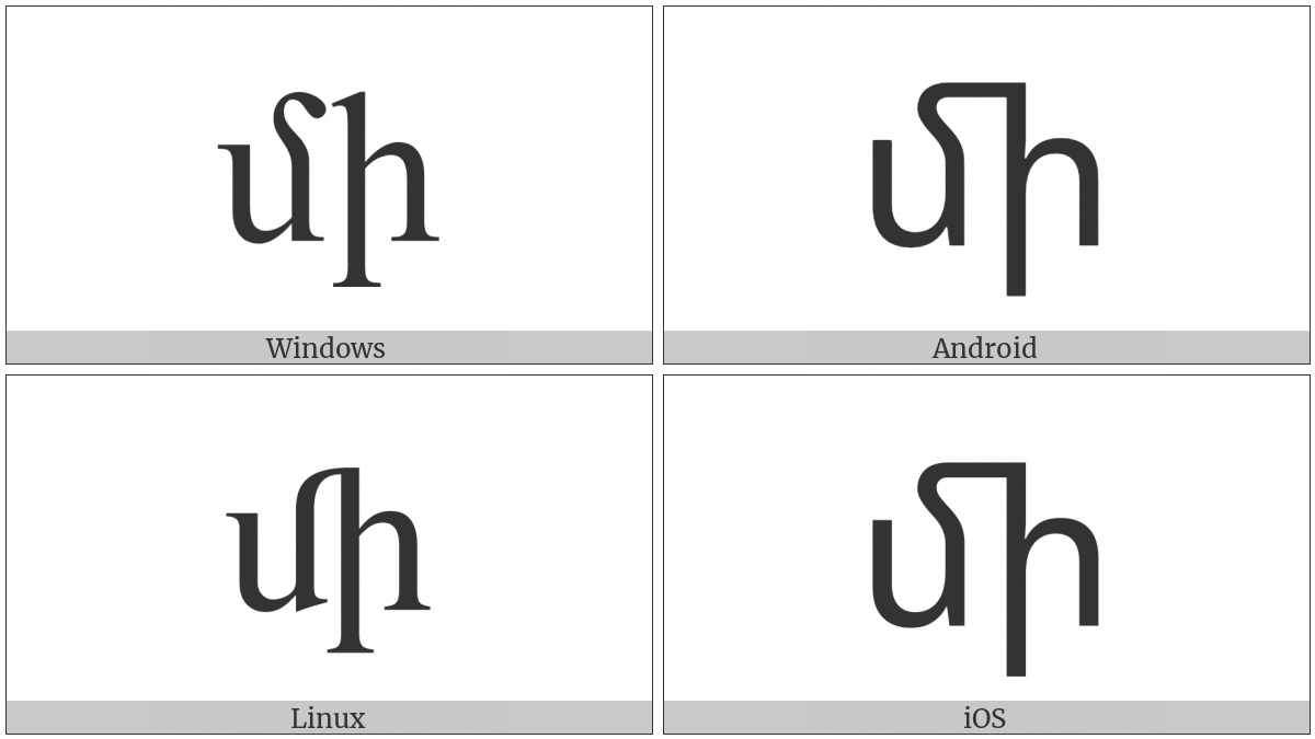 The image below shows how the “Armenian Small Ligature Men Ini” symbol might look like on different operating systems. If the font in which this web site is displayed does not contain the symbol and there is no fallback font able to render it, you can use the image below to get an idea of what it should look like.