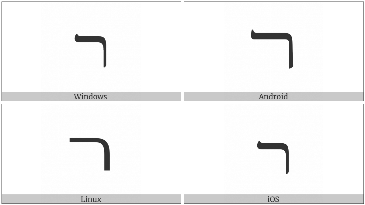 The image below shows how the “Hebrew Letter Wide Resh” symbol might look like on different operating systems. If the font in which this web site is displayed does not contain the symbol and there is no fallback font able to render it, you can use the image below to get an idea of what it should look like.