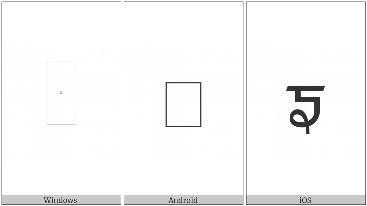 The image below shows how the “Limbu Letter Tra” symbol might look like on different operating systems. If the font in which this web site is displayed does not contain the symbol and there is no fallback font able to render it, you can use the image below to get an idea of what it should look like.