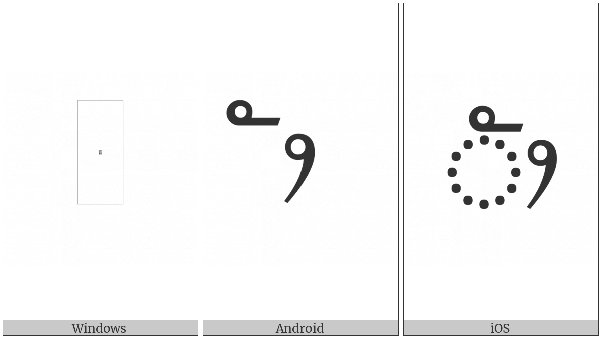 The image below shows how the “Limbu Vowel Sign Oo” symbol might look like on different operating systems. If the font in which this web site is displayed does not contain the symbol and there is no fallback font able to render it, you can use the image below to get an idea of what it should look like.