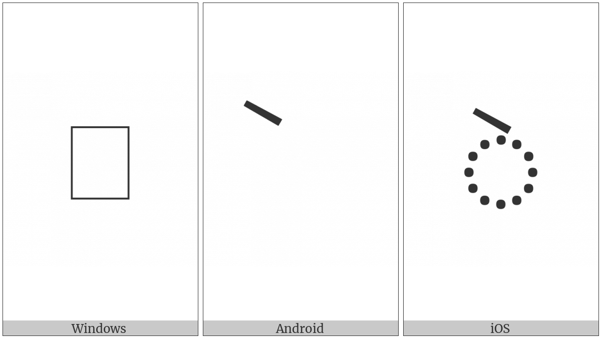 The image below shows how the “Limbu Vowel Sign E” symbol might look like on different operating systems. If the font in which this web site is displayed does not contain the symbol and there is no fallback font able to render it, you can use the image below to get an idea of what it should look like.