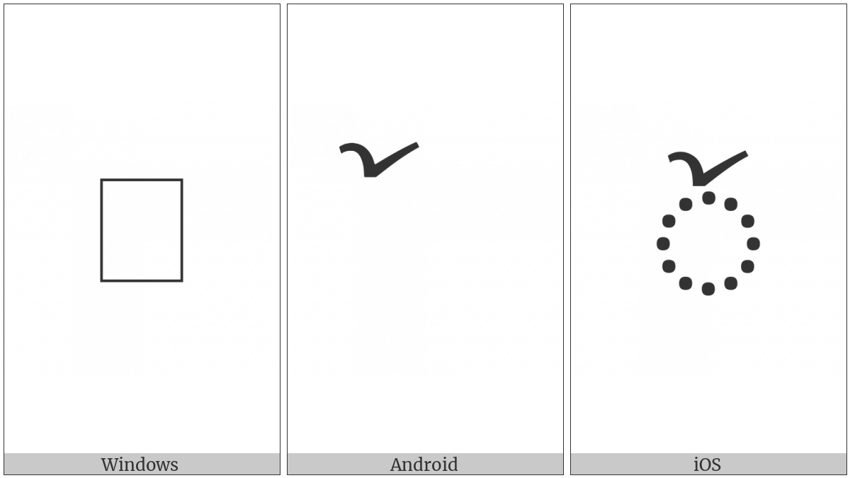 The image below shows how the “Limbu Vowel Sign O” symbol might look like on different operating systems. If the font in which this web site is displayed does not contain the symbol and there is no fallback font able to render it, you can use the image below to get an idea of what it should look like.