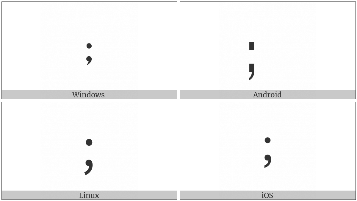 The image below shows how the “Small Semicolon” symbol might look like on different operating systems. If the font in which this web site is displayed does not contain the symbol and there is no fallback font able to render it, you can use the image below to get an idea of what it should look like.