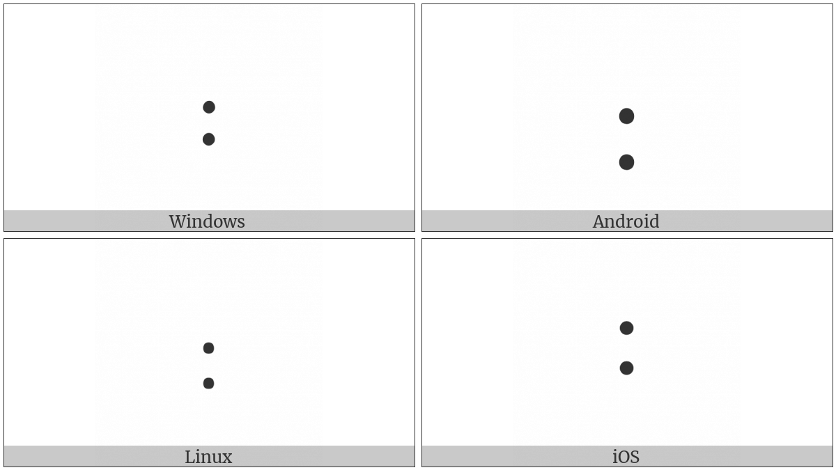 The image below shows how the “Small Colon” symbol might look like on different operating systems. If the font in which this web site is displayed does not contain the symbol and there is no fallback font able to render it, you can use the image below to get an idea of what it should look like.