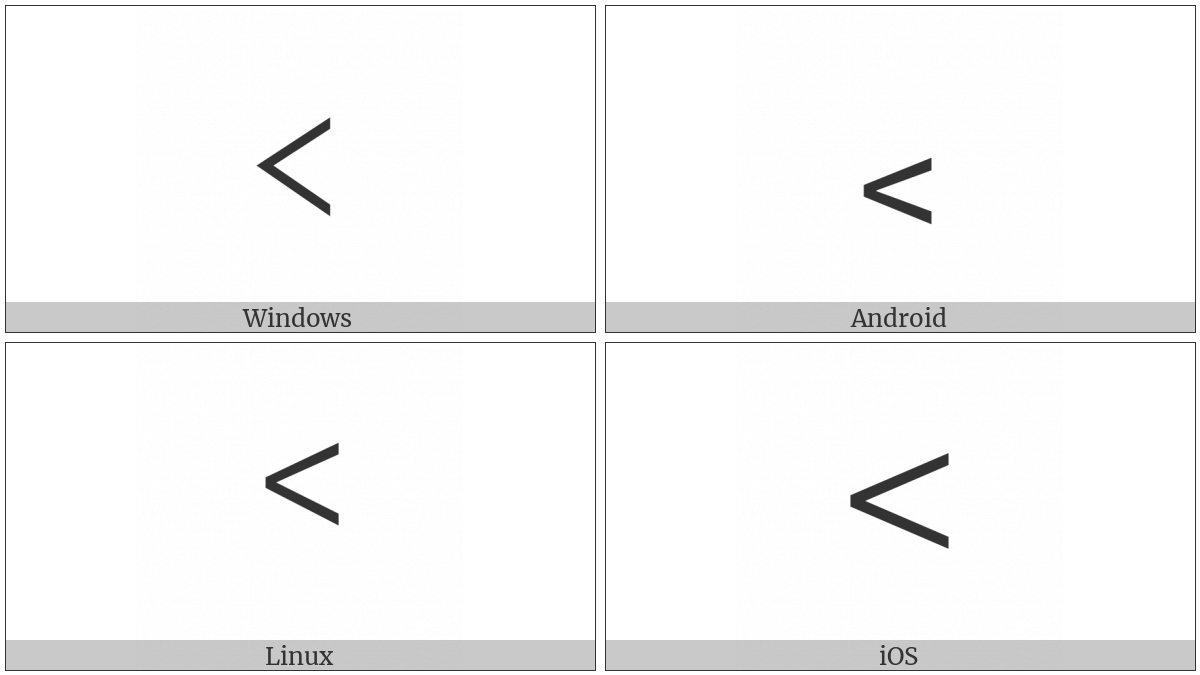 The image below shows how the “Small Less-Than Sign” symbol might look like on different operating systems. If the font in which this web site is displayed does not contain the symbol and there is no fallback font able to render it, you can use the image below to get an idea of what it should look like.
