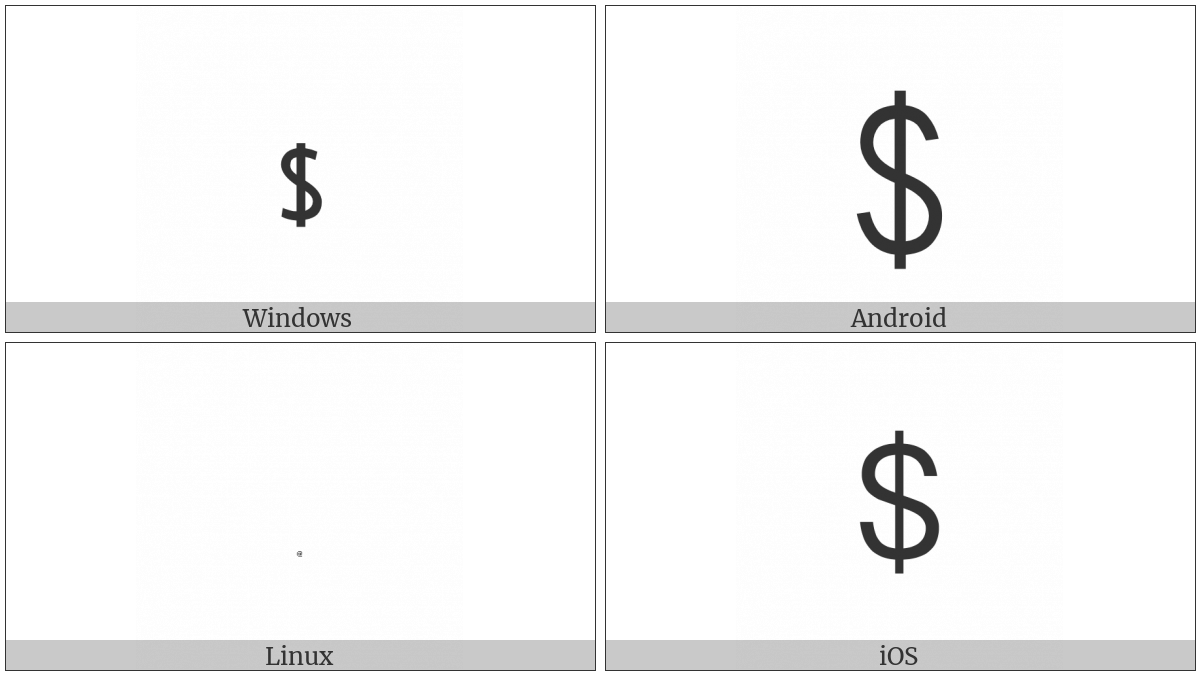 The image below shows how the “Small Dollar Sign” symbol might look like on different operating systems. If the font in which this web site is displayed does not contain the symbol and there is no fallback font able to render it, you can use the image below to get an idea of what it should look like.