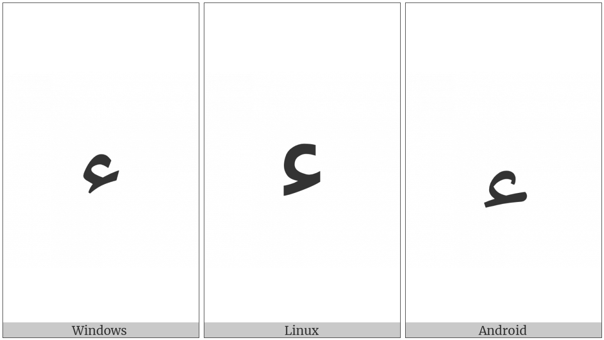 The image below shows how the “Arabic Letter Hamza Isolated Form” symbol might look like on different operating systems. If the font in which this web site is displayed does not contain the symbol and there is no fallback font able to render it, you can use the image below to get an idea of what it should look like.
