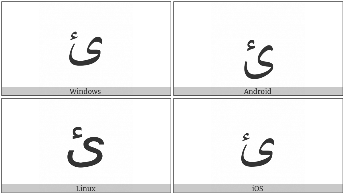 The image below shows how the “Arabic Letter Yeh With Hamza Above Isolated Form” symbol might look like on different operating systems. If the font in which this web site is displayed does not contain the symbol and there is no fallback font able to render it, you can use the image below to get an idea of what it should look like.