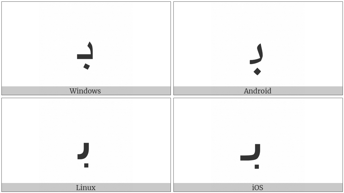 The image below shows how the “Arabic Letter Beh Initial Form” symbol might look like on different operating systems. If the font in which this web site is displayed does not contain the symbol and there is no fallback font able to render it, you can use the image below to get an idea of what it should look like.
