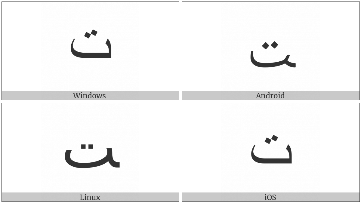 The image below shows how the “Arabic Letter Teh Final Form” symbol might look like on different operating systems. If the font in which this web site is displayed does not contain the symbol and there is no fallback font able to render it, you can use the image below to get an idea of what it should look like.