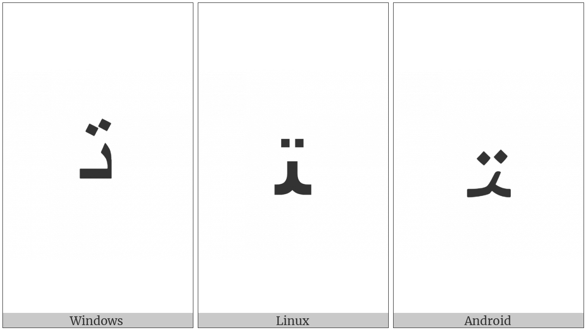 The image below shows how the “Arabic Letter Teh Medial Form” symbol might look like on different operating systems. If the font in which this web site is displayed does not contain the symbol and there is no fallback font able to render it, you can use the image below to get an idea of what it should look like.