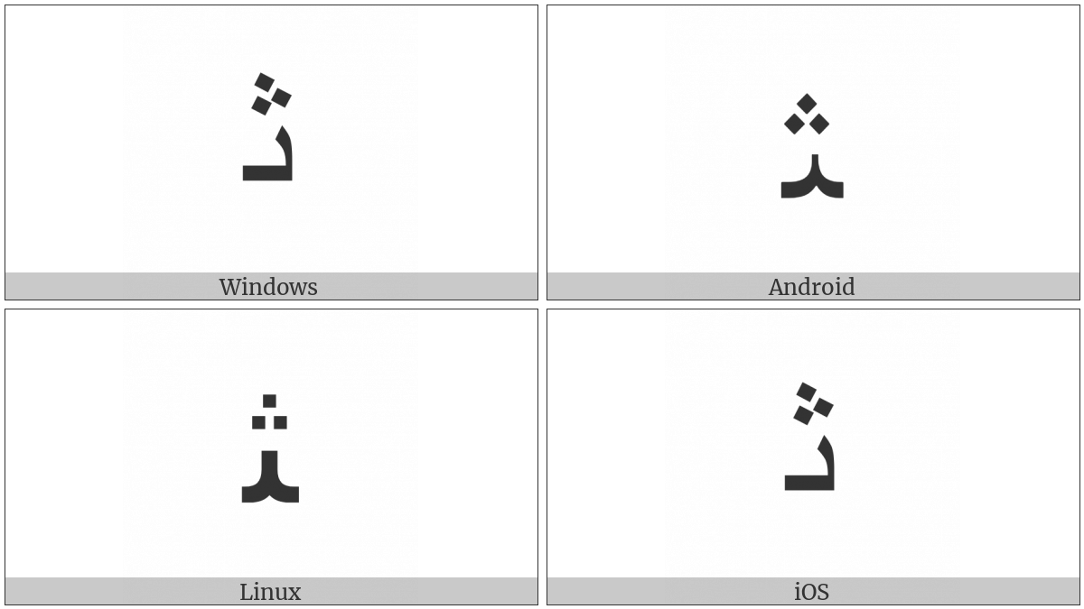 The image below shows how the “Arabic Letter Theh Medial Form” symbol might look like on different operating systems. If the font in which this web site is displayed does not contain the symbol and there is no fallback font able to render it, you can use the image below to get an idea of what it should look like.