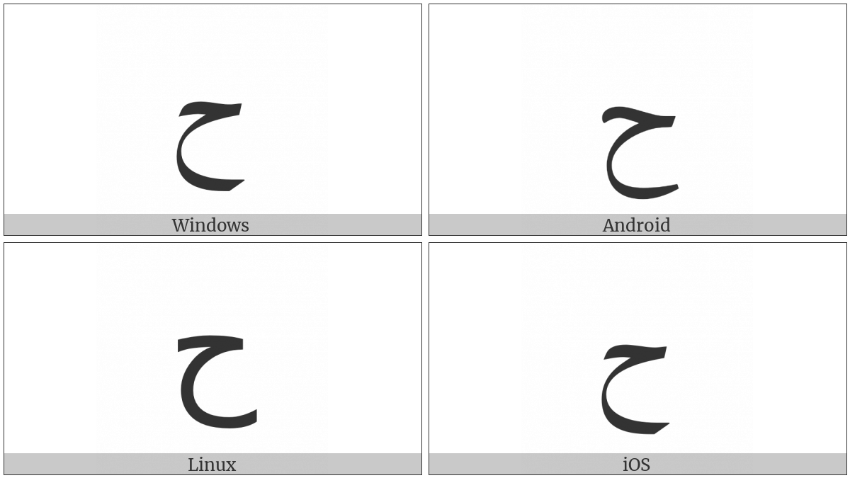 The image below shows how the “Arabic Letter Hah Isolated Form” symbol might look like on different operating systems. If the font in which this web site is displayed does not contain the symbol and there is no fallback font able to render it, you can use the image below to get an idea of what it should look like.