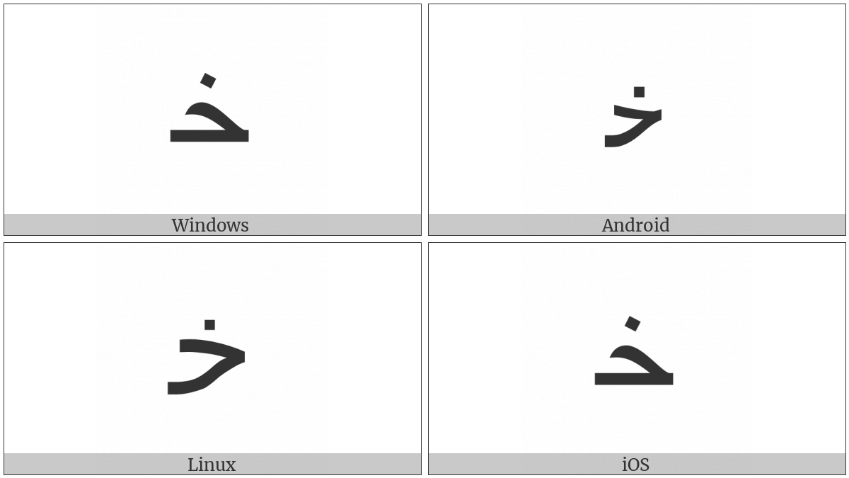The image below shows how the “Arabic Letter Khah Initial Form” symbol might look like on different operating systems. If the font in which this web site is displayed does not contain the symbol and there is no fallback font able to render it, you can use the image below to get an idea of what it should look like.