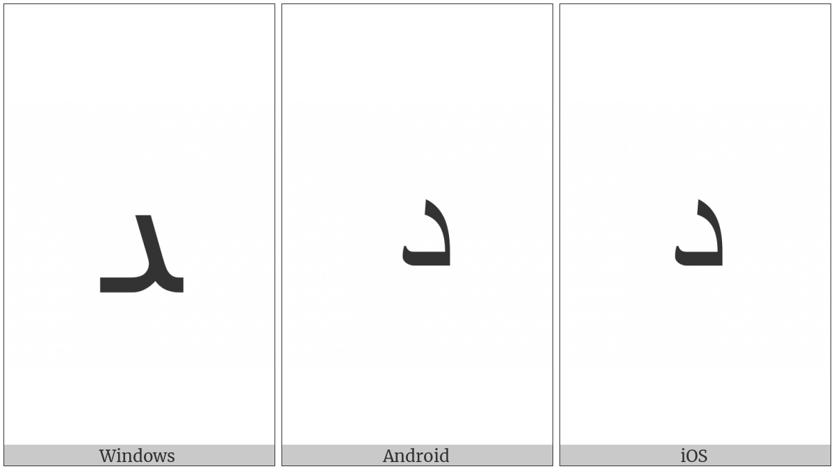 The image below shows how the “Arabic Letter Dal Final Form” symbol might look like on different operating systems. If the font in which this web site is displayed does not contain the symbol and there is no fallback font able to render it, you can use the image below to get an idea of what it should look like.