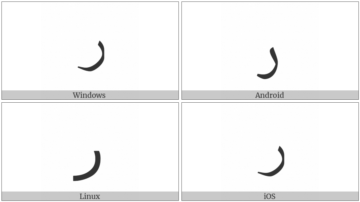 The image below shows how the “Arabic Letter Reh Isolated Form” symbol might look like on different operating systems. If the font in which this web site is displayed does not contain the symbol and there is no fallback font able to render it, you can use the image below to get an idea of what it should look like.