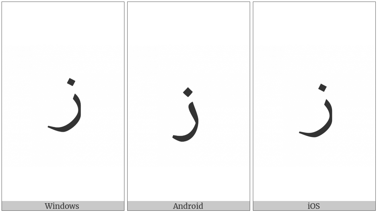 The image below shows how the “Arabic Letter Zain Isolated Form” symbol might look like on different operating systems. If the font in which this web site is displayed does not contain the symbol and there is no fallback font able to render it, you can use the image below to get an idea of what it should look like.