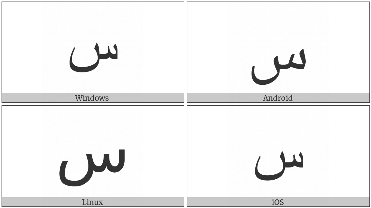 The image below shows how the “Arabic Letter Seen Isolated Form” symbol might look like on different operating systems. If the font in which this web site is displayed does not contain the symbol and there is no fallback font able to render it, you can use the image below to get an idea of what it should look like.