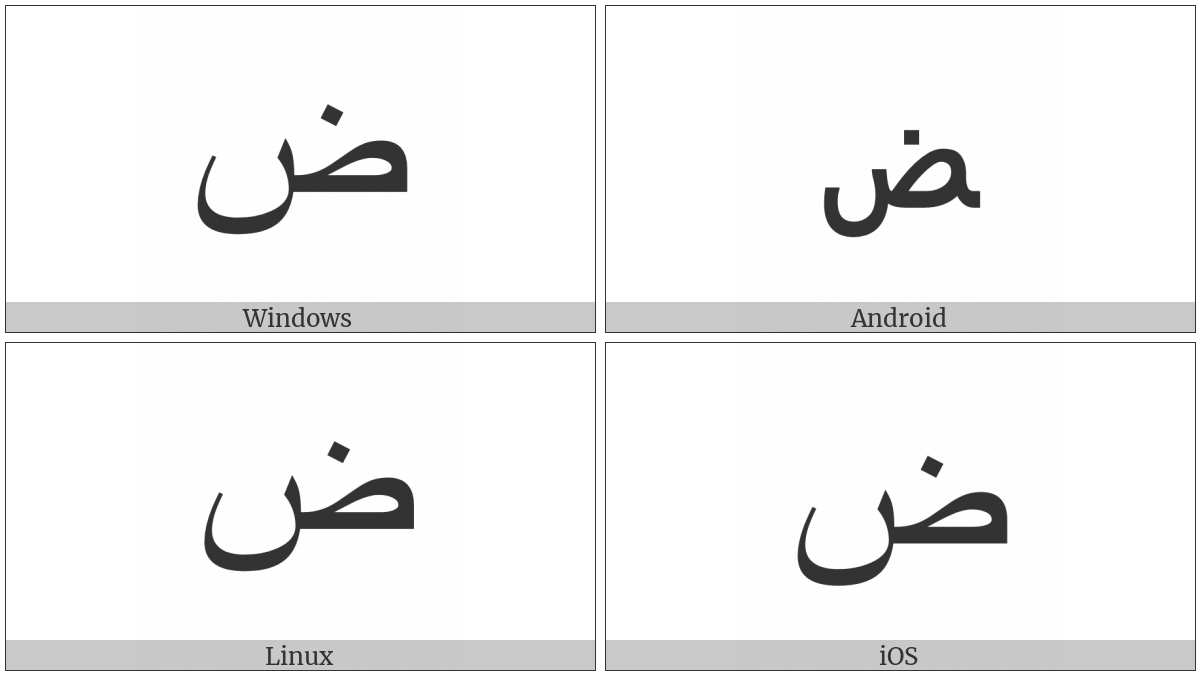 The image below shows how the “Arabic Letter Dad Final Form” symbol might look like on different operating systems. If the font in which this web site is displayed does not contain the symbol and there is no fallback font able to render it, you can use the image below to get an idea of what it should look like.