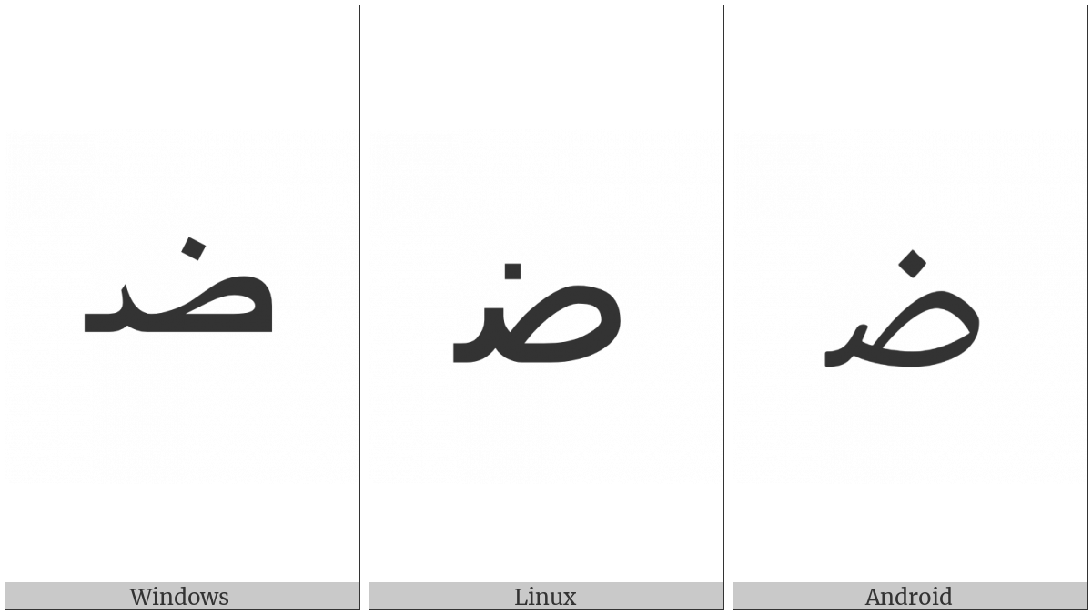 The image below shows how the “Arabic Letter Dad Initial Form” symbol might look like on different operating systems. If the font in which this web site is displayed does not contain the symbol and there is no fallback font able to render it, you can use the image below to get an idea of what it should look like.