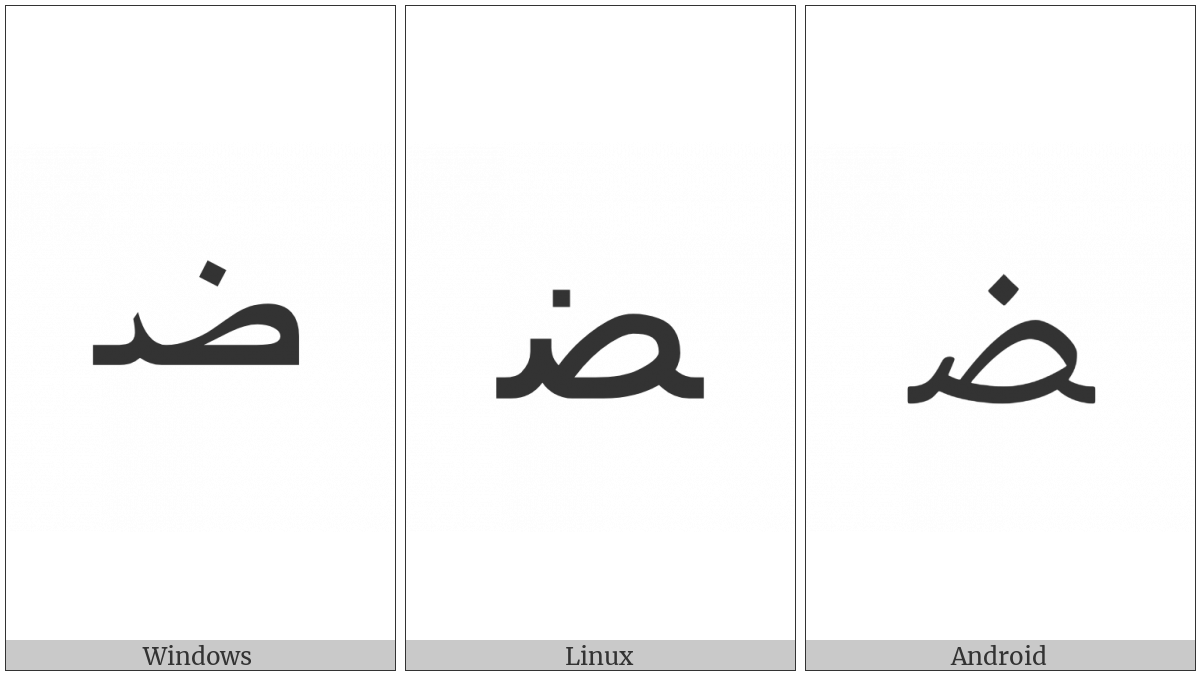 The image below shows how the “Arabic Letter Dad Medial Form” symbol might look like on different operating systems. If the font in which this web site is displayed does not contain the symbol and there is no fallback font able to render it, you can use the image below to get an idea of what it should look like.