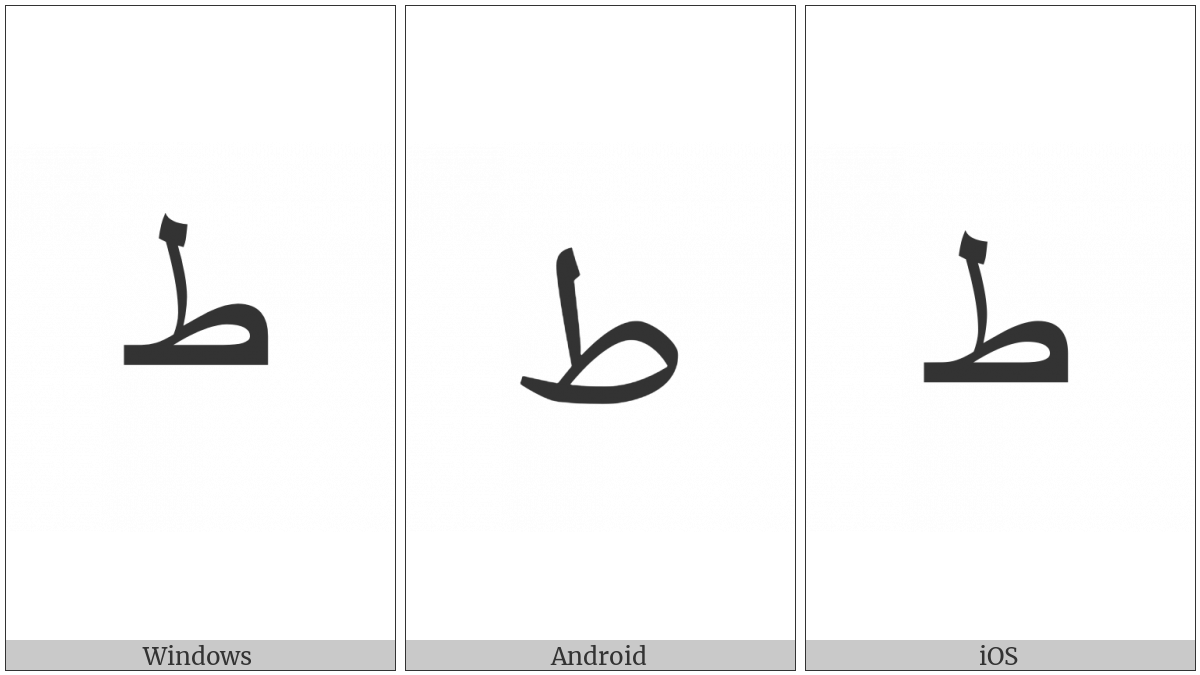 The image below shows how the “Arabic Letter Tah Isolated Form” symbol might look like on different operating systems. If the font in which this web site is displayed does not contain the symbol and there is no fallback font able to render it, you can use the image below to get an idea of what it should look like.