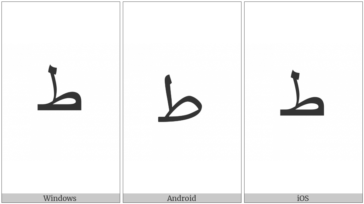 The image below shows how the “Arabic Letter Tah Initial Form” symbol might look like on different operating systems. If the font in which this web site is displayed does not contain the symbol and there is no fallback font able to render it, you can use the image below to get an idea of what it should look like.