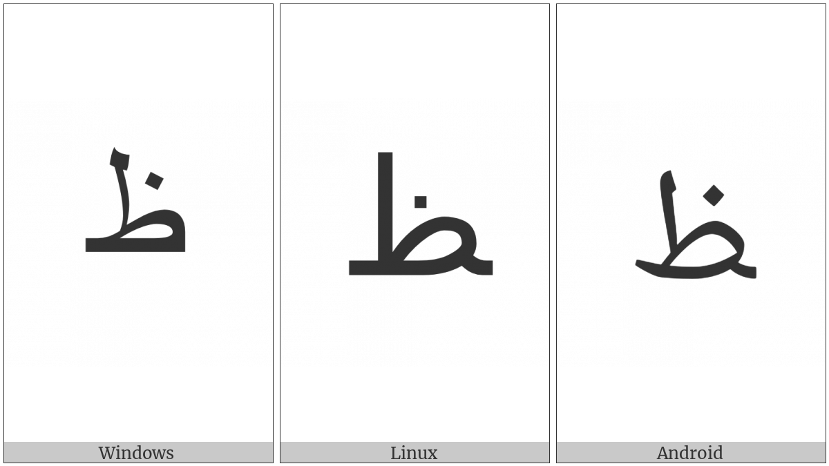 The image below shows how the “Arabic Letter Zah Final Form” symbol might look like on different operating systems. If the font in which this web site is displayed does not contain the symbol and there is no fallback font able to render it, you can use the image below to get an idea of what it should look like.