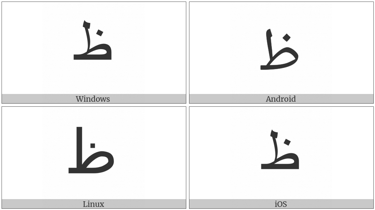The image below shows how the “Arabic Letter Zah Initial Form” symbol might look like on different operating systems. If the font in which this web site is displayed does not contain the symbol and there is no fallback font able to render it, you can use the image below to get an idea of what it should look like.