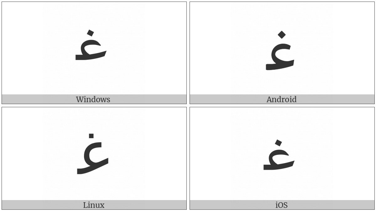 The image below shows how the “Arabic Letter Ghain Initial Form” symbol might look like on different operating systems. If the font in which this web site is displayed does not contain the symbol and there is no fallback font able to render it, you can use the image below to get an idea of what it should look like.