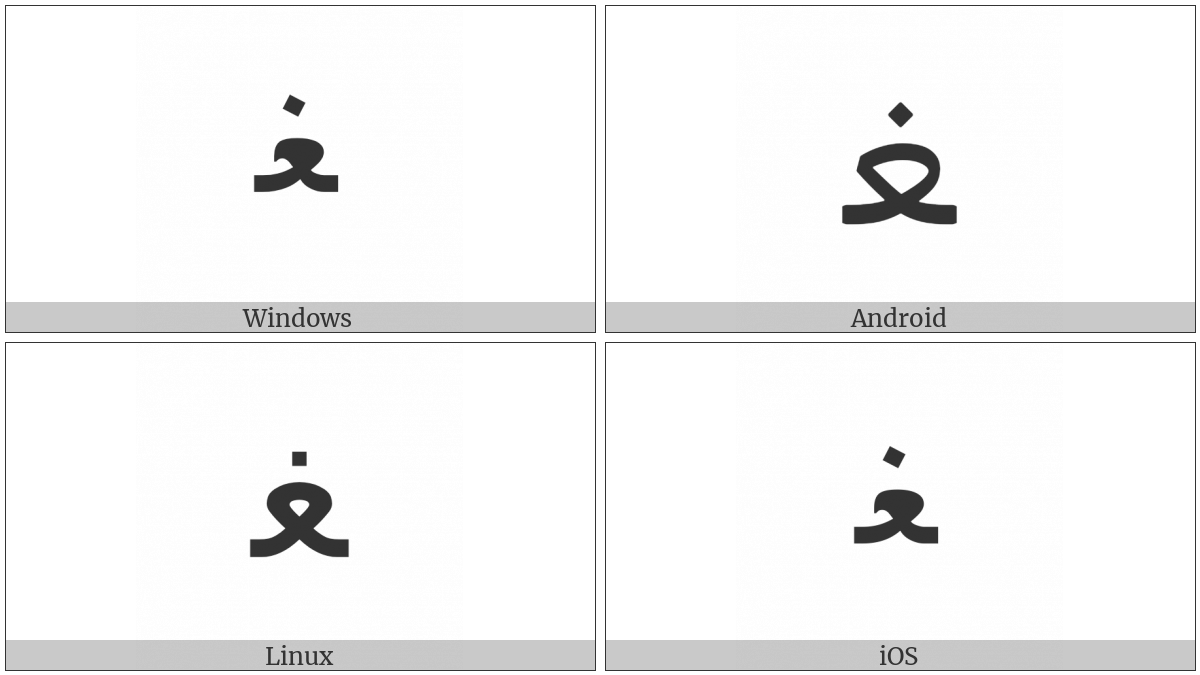 The image below shows how the “Arabic Letter Ghain Medial Form” symbol might look like on different operating systems. If the font in which this web site is displayed does not contain the symbol and there is no fallback font able to render it, you can use the image below to get an idea of what it should look like.