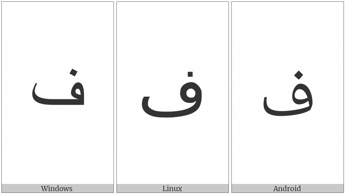 The image below shows how the “Arabic Letter Feh Isolated Form” symbol might look like on different operating systems. If the font in which this web site is displayed does not contain the symbol and there is no fallback font able to render it, you can use the image below to get an idea of what it should look like.