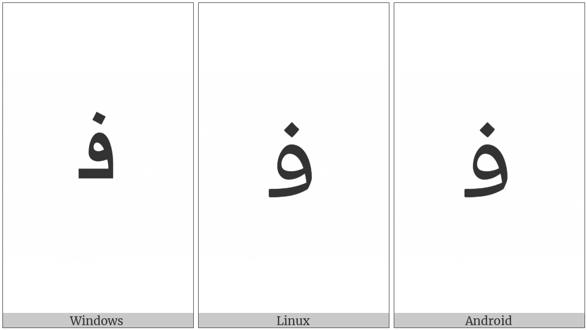 The image below shows how the “Arabic Letter Feh Initial Form” symbol might look like on different operating systems. If the font in which this web site is displayed does not contain the symbol and there is no fallback font able to render it, you can use the image below to get an idea of what it should look like.