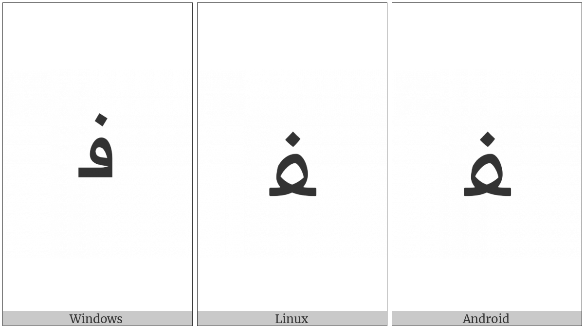 The image below shows how the “Arabic Letter Feh Medial Form” symbol might look like on different operating systems. If the font in which this web site is displayed does not contain the symbol and there is no fallback font able to render it, you can use the image below to get an idea of what it should look like.