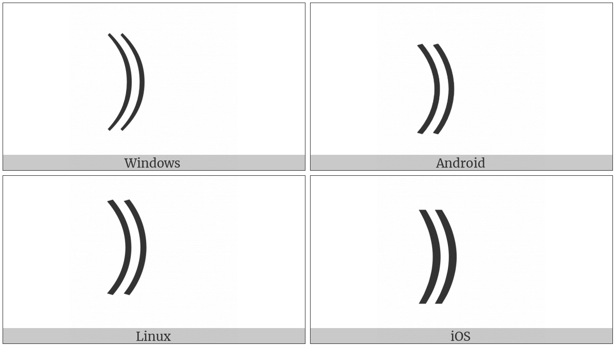 The image below shows how the “Fullwidth Right White Parenthesis” symbol might look like on different operating systems. If the font in which this web site is displayed does not contain the symbol and there is no fallback font able to render it, you can use the image below to get an idea of what it should look like.