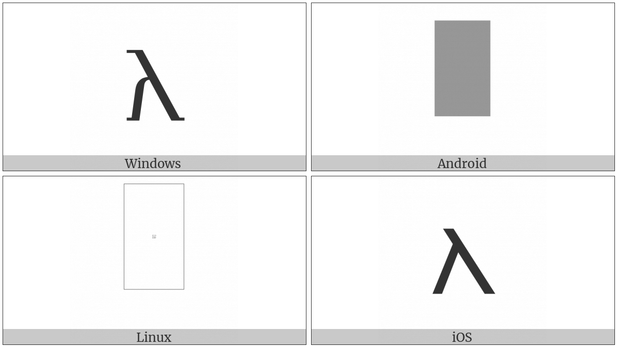 The image below shows how the “Gothic Letter Lagus” symbol might look like on different operating systems. If the font in which this web site is displayed does not contain the symbol and there is no fallback font able to render it, you can use the image below to get an idea of what it should look like.