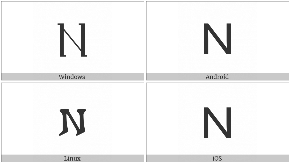 The image below shows how the “Gothic Letter Nauths” symbol might look like on different operating systems. If the font in which this web site is displayed does not contain the symbol and there is no fallback font able to render it, you can use the image below to get an idea of what it should look like.