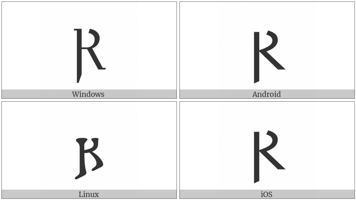 The image below shows how the “Gothic Letter Raida” symbol might look like on different operating systems. If the font in which this web site is displayed does not contain the symbol and there is no fallback font able to render it, you can use the image below to get an idea of what it should look like.