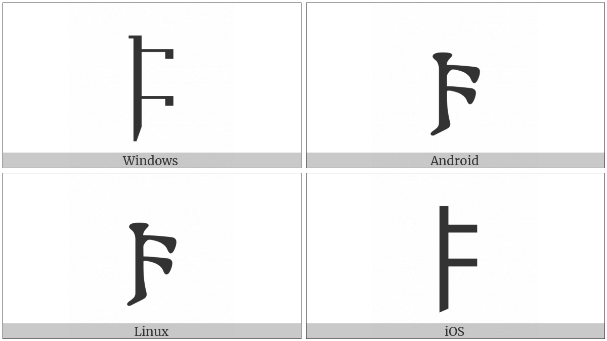 The image below shows how the “Gothic Letter Faihu” symbol might look like on different operating systems. If the font in which this web site is displayed does not contain the symbol and there is no fallback font able to render it, you can use the image below to get an idea of what it should look like.