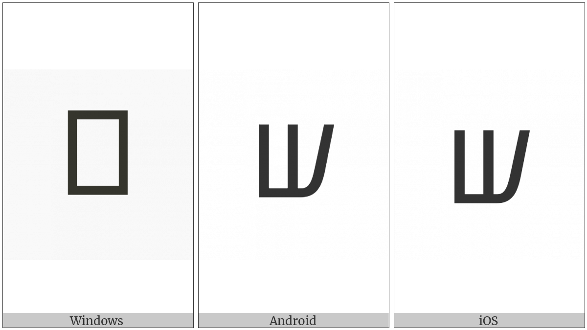 The image below shows how the “Old Permic Letter Shchooi” symbol might look like on different operating systems. If the font in which this web site is displayed does not contain the symbol and there is no fallback font able to render it, you can use the image below to get an idea of what it should look like.