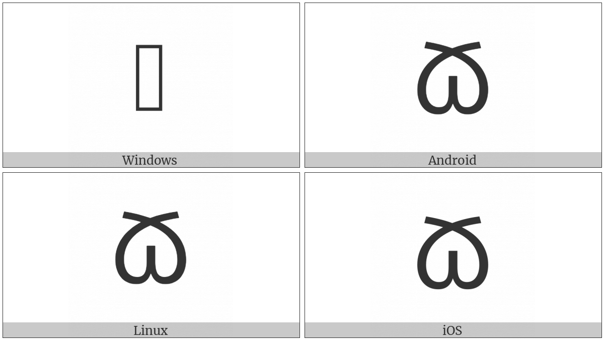 The image below shows how the “Old Permic Letter Ef” symbol might look like on different operating systems. If the font in which this web site is displayed does not contain the symbol and there is no fallback font able to render it, you can use the image below to get an idea of what it should look like.