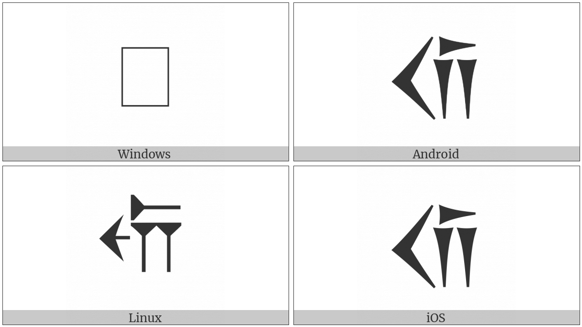 The image below shows how the “Old Persian Sign U” symbol might look like on different operating systems. If the font in which this web site is displayed does not contain the symbol and there is no fallback font able to render it, you can use the image below to get an idea of what it should look like.