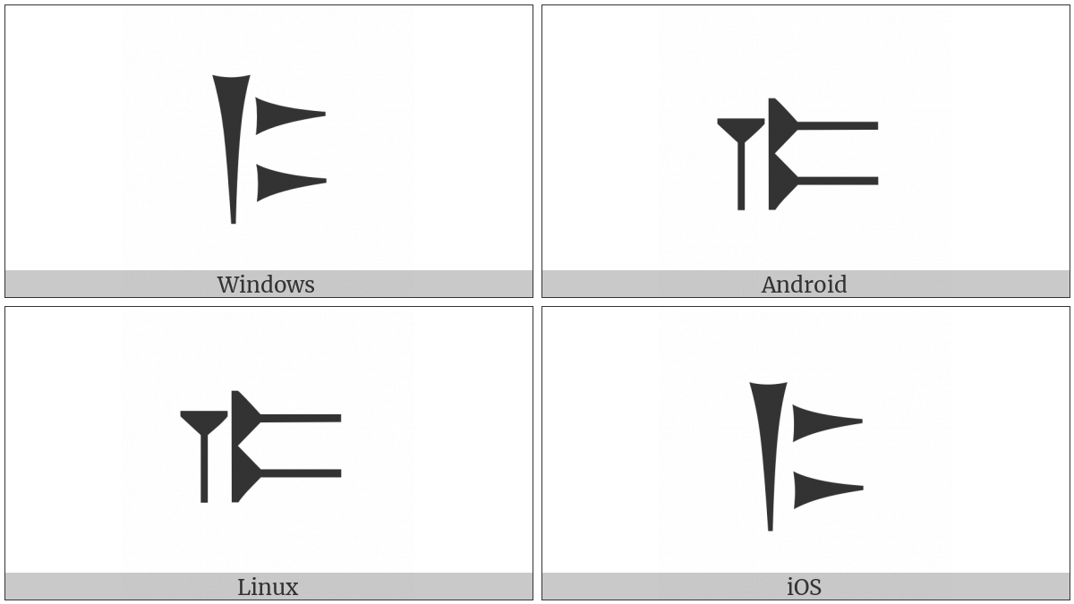 The image below shows how the “Old Persian Sign Ka” symbol might look like on different operating systems. If the font in which this web site is displayed does not contain the symbol and there is no fallback font able to render it, you can use the image below to get an idea of what it should look like.