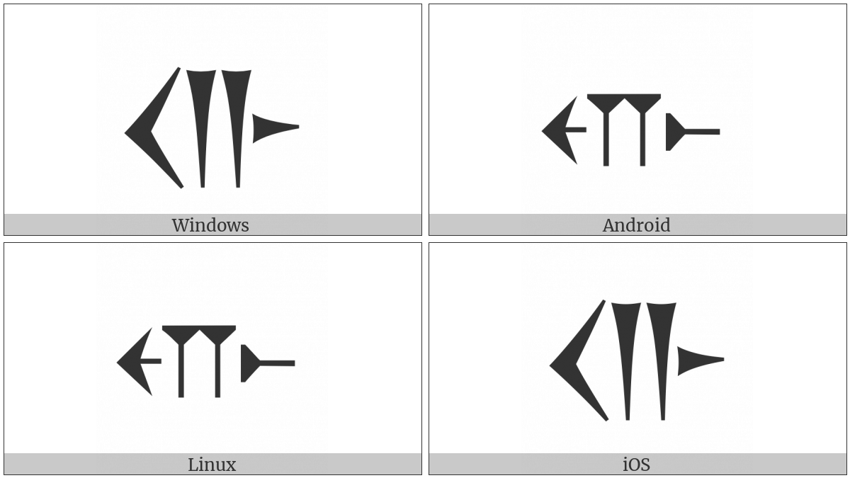 The image below shows how the “Old Persian Sign Ga” symbol might look like on different operating systems. If the font in which this web site is displayed does not contain the symbol and there is no fallback font able to render it, you can use the image below to get an idea of what it should look like.